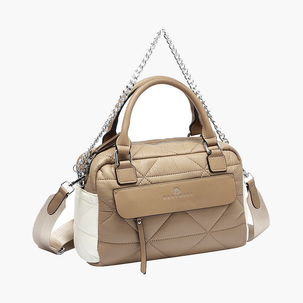 Δίχρωμη, ευρύχωρη και πρακτική τσάντα ώμου βαρελάκι από την Bartuggi, που μπορεί να φορεθεί και ως χιαστί. Έχει κομψό συνδυασμό χρωμάτων και πρωτοποριακό υλικό με εξαιρετικά απαλή υφή σε καπιτονέ pattern, κάνοντάς την ιδανική για καθημερινή χρήση. Εσωτερικά διαθέτει 3 τσέπες, με τη μία να κλείνει με φερμουάρ για μεγαλύτερη ασφάλεια. Εξωτερικά, περιλαμβάνει 1 τσέπη μπροστά κάτω από το καπάκι με φερμουάρ, καθώς και 1 τσεπάκι πίσω με φερμουάρ. Η τσάντα συνοδεύεται από φανέλα αποθήκευσης και προσαρμοζόμενο ιμάντα για να την προσαρμόσετε άνετα στο μήκος που σας βολεύει.