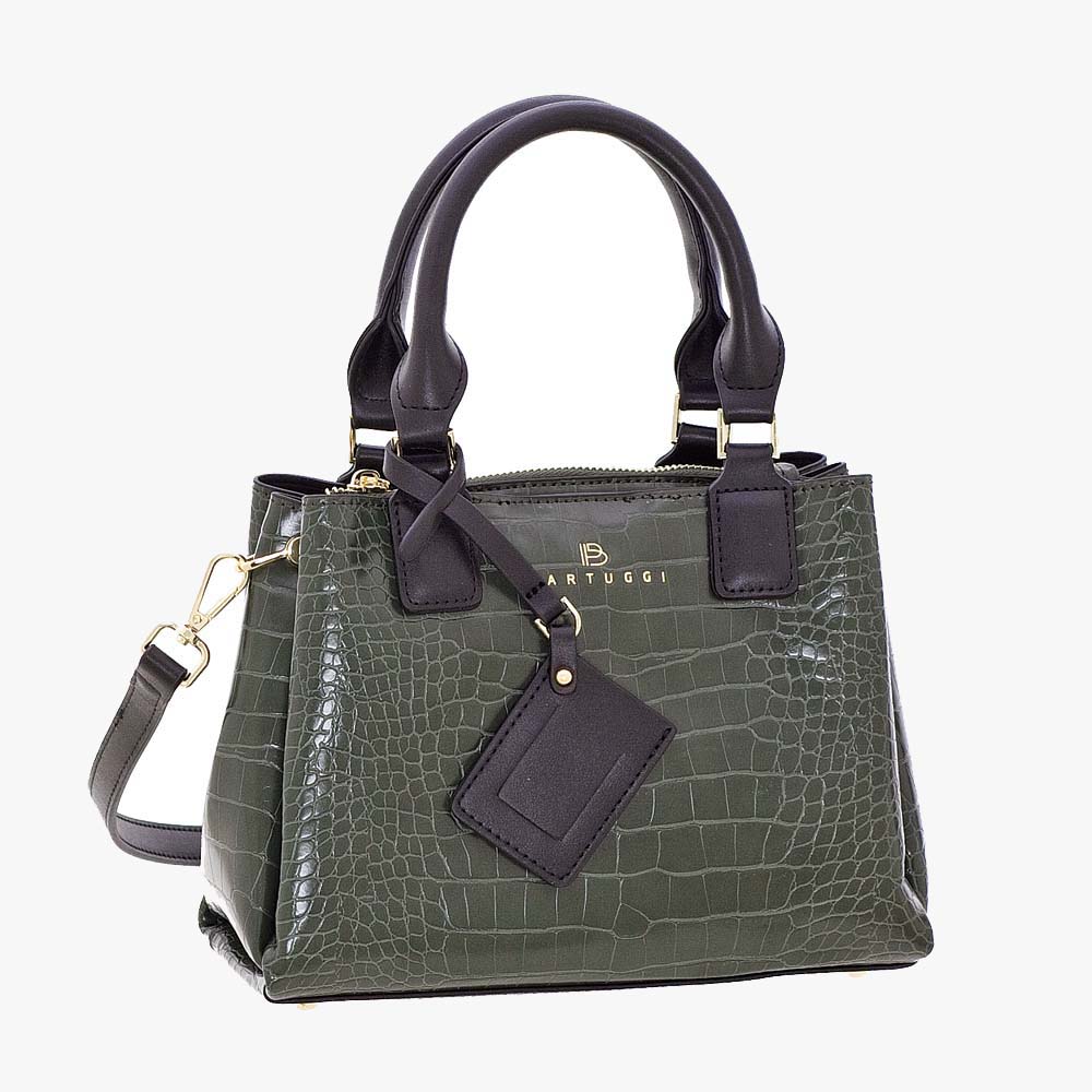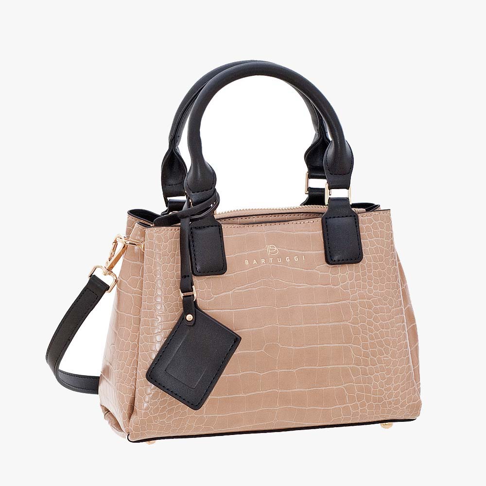 Κροκό τσάντα με διχρωμία που φοριέται και ως χιαστί, σε ζεστές αποχρώσεις. Διαθέτει λαβές χειρός, προσαρμοζόμενι ιμάντα ώμου και κρεμαστή ετικέτα κατόχου. Εσωτερικά διαθέτει 3 χώρους, εκ των οποίων ο ένας κλείνει με φερμουάρ. Μια πολύ ιδιαίτερη τσάντα για μοναδικές εμφανίσεις