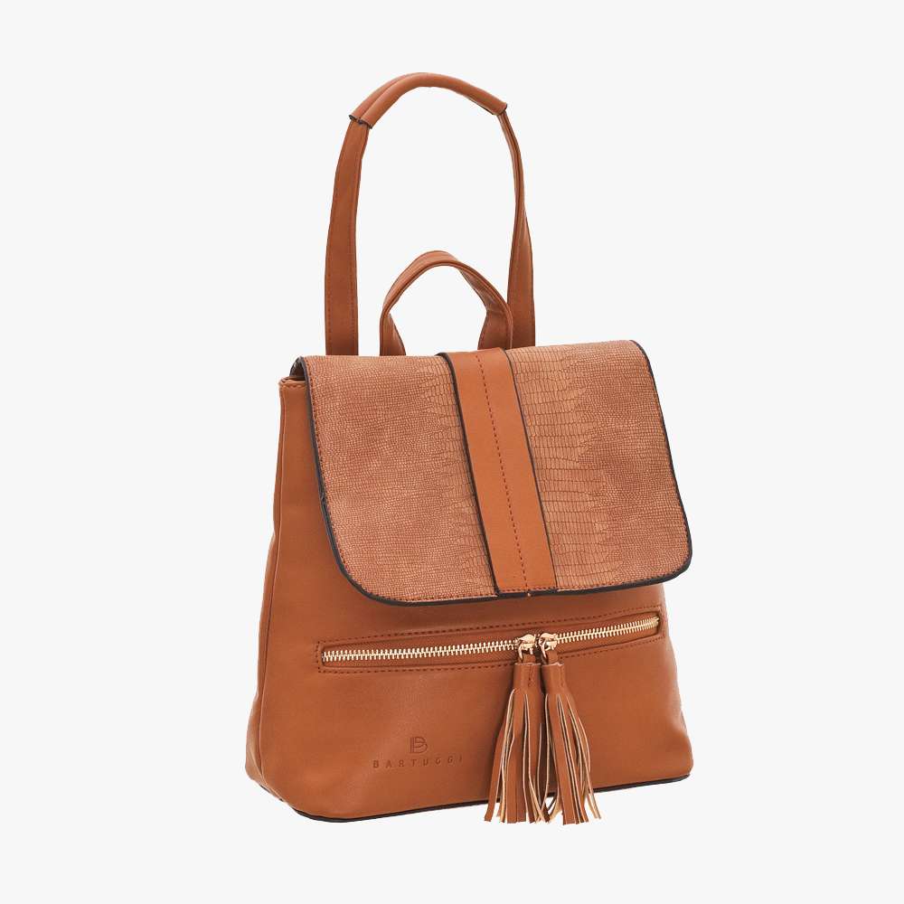 Γυναικείο, ευρύχωρο σακίδιο BARTUGGI με καπάκι από φίδι και μπροστινό τσεπάκι. Είναι πολύ ανθεκτικό και διατίθεται σε ζεστά, μοντέρνα χρώματα.