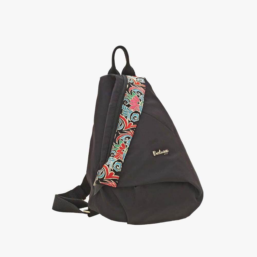 Ιδιαίτερο σακίδιο BARTUGGI με αντικλεπτικό σχεδιασμό, που ασφαλίζει με φερμουάρ στο μπροστινό μέρος και κλείνει με γατζάκι στο πλάι προσδίδοντας του έτσι ένα ιδιαίτερο τριγωνικό σχήμα. Διατίθεται σε μαύρο χρώμα με λεπτομέρειες από χειροποίητο κέντημα.