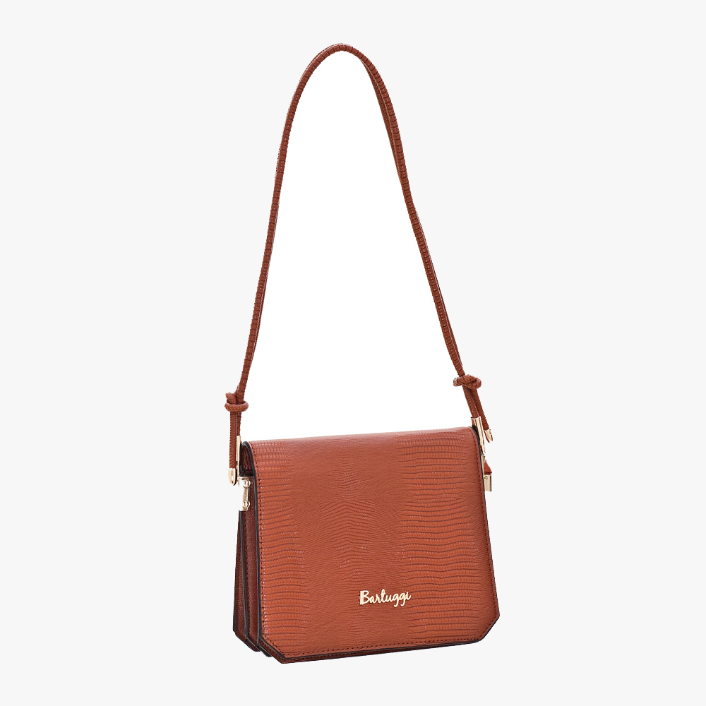 τσαντάκι χιαστί από κροκό υλικό με καπάκι και ιδιαίτερο χεράκι. Εσωτερικά διαθέτει 2 ξεχωριστές θέσεις με 2 τσεπάκια, εκ των οποίων το ένα κλείνει με φερμουάρ.